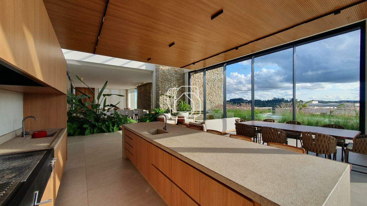 A área social é marcada por um design clean e sofisticado, com sala de estar ampla, lareira, e uma sala de jantar integrada a um paisagismo interno, criando um ambiente acolhedor e naturalmente iluminado. A cozinha possui armários e com ilha, totalmente equipada. Já o espaço gourmet é ideal para receber convidados, com churrasqueira e vista para a área da piscina.
